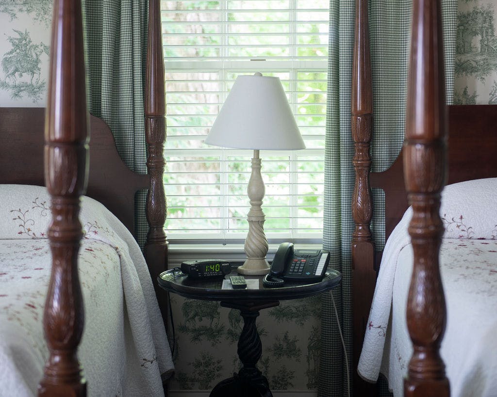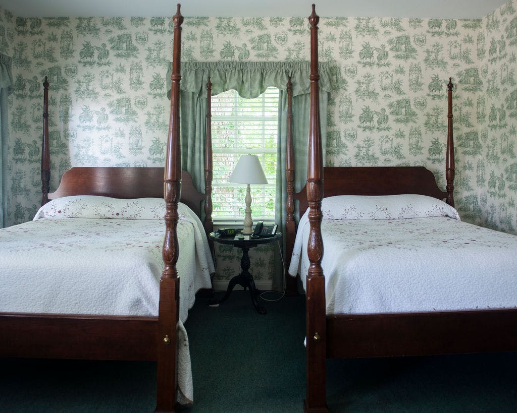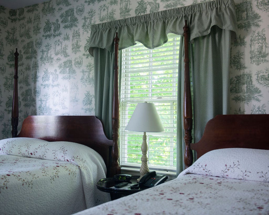 With its French provincial toile wall covering, green gingham curtains and country quilts, the Almeda Booth Suite welcomes its guests. The room features two full-size four-poster beds, armoire and and dressing table.