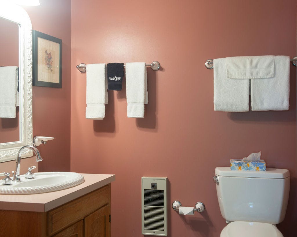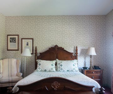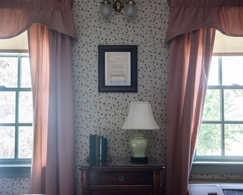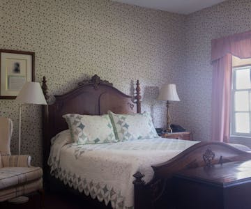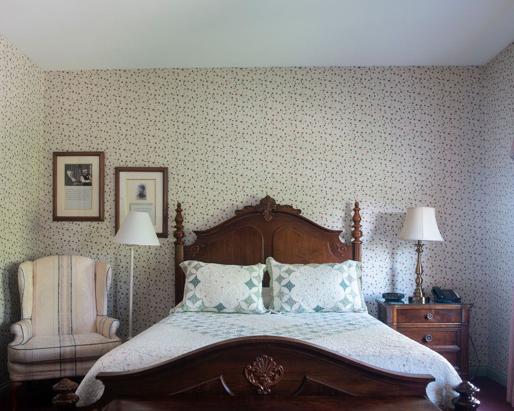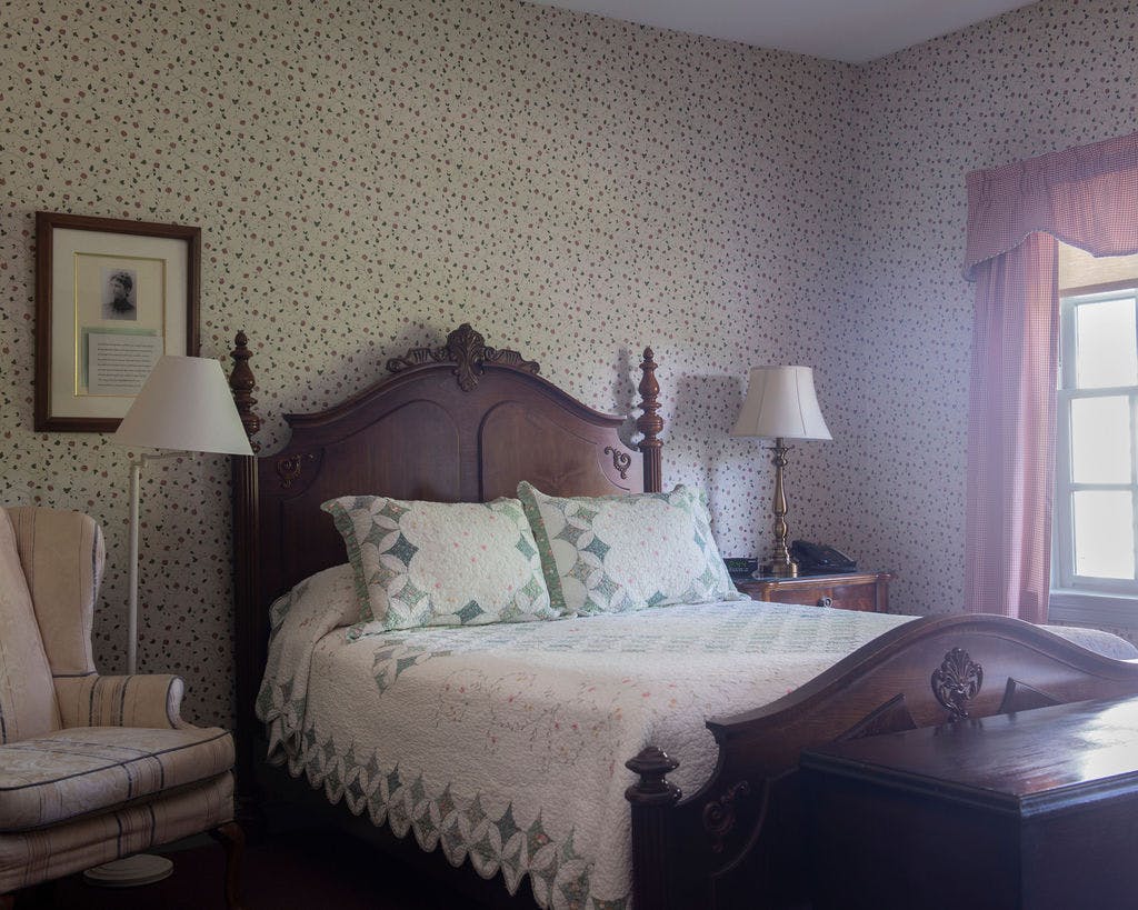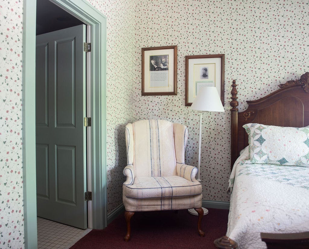 The Jessie Brown Pounds Suite takes its guests back to a time of quiet elegance. A wing-backed chair, red gingham curtains, and tiny flowered wallpaper complement the antique queen-sized bed and whisper romance to its guests.